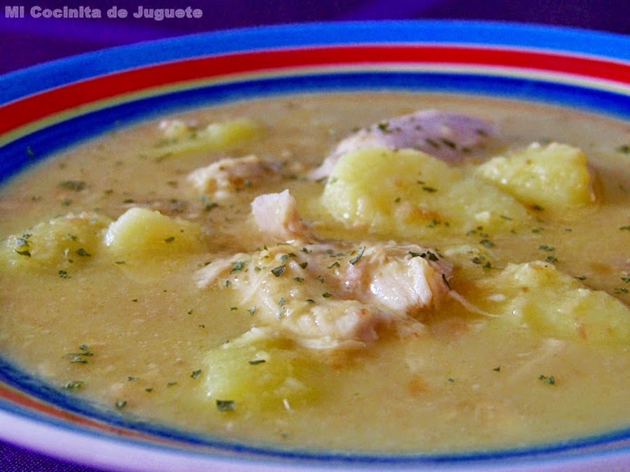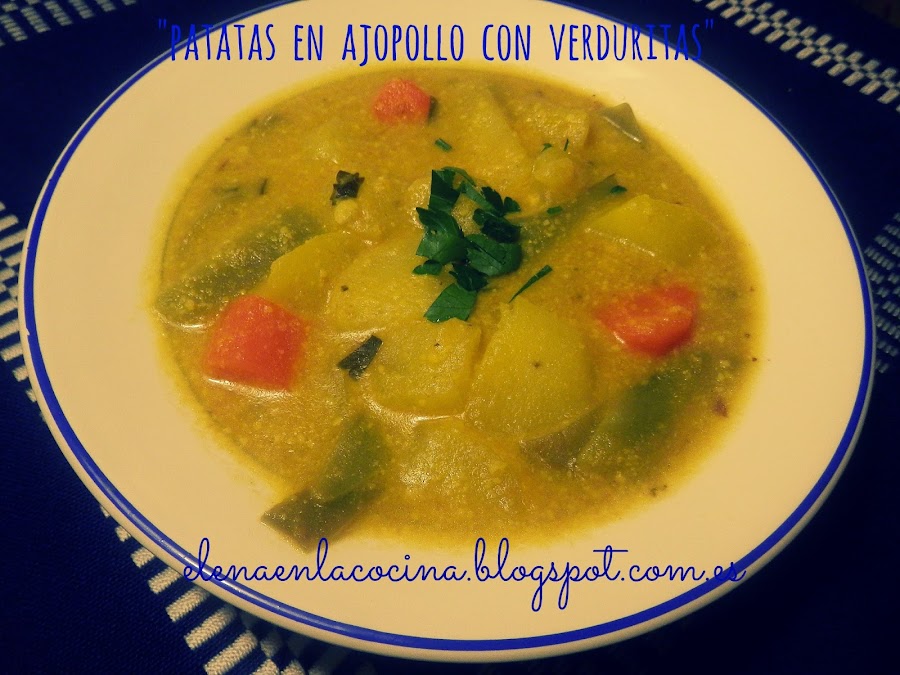 Tytiana, desde Mi cocinilla de juguete nos envía las patatas en ajopollo. Un guiso típico de Granada y otras zonas de Andalucía que consiste en patatas cocidas con un majado de ajo, almendras y pan fritos donde el pollo es opcional. Aunque la receta se llame "ajopollo", realmente no lleva pollo.