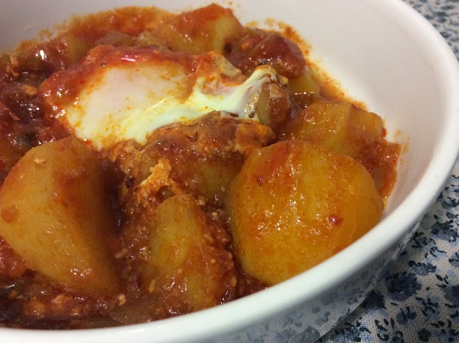 Trini, del blog Curry y chocolate nos cuenta que esta deliciosa receta la preparaba su padre siempre que podían escabullirse de su madre: patatas con chorizo y huevo.