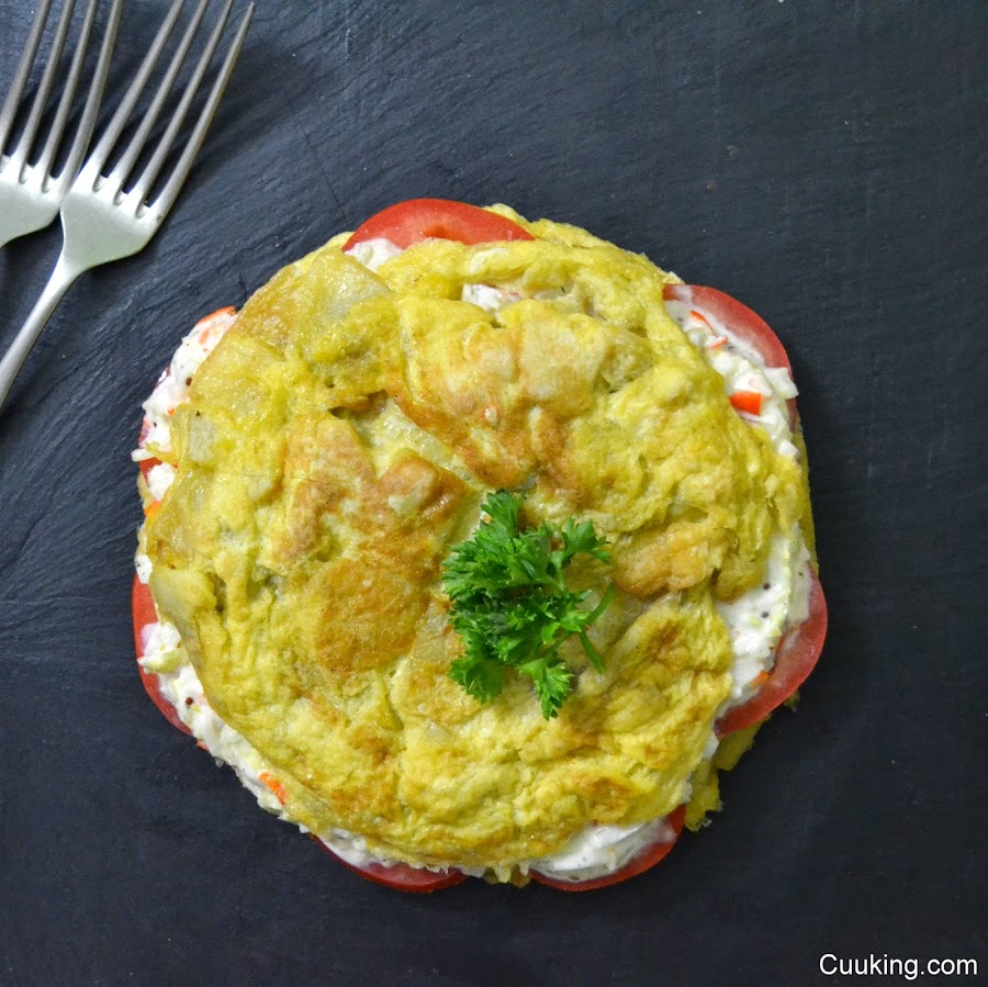 Juanan, del blog Cuuking, nos propone esta deliciosa versión de la tortilla de patata rellena de surimi que, desde ya, se va a la lista de recetas que tengo que hacer: