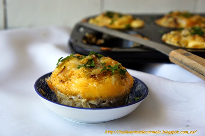 Carmela, del blog Los inventos de Carmela, nos presenta una de sus "carmeladas": Cestitas de queso, bacon y huevo.
