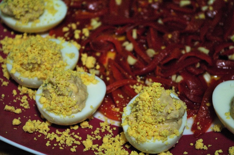 Margot, del blog El cajón desastre de Maggie, nos cuenta que "Rebuscando en mi despensa encontré un bote de pimientos de piquillo y una lata de atún, que nunca pueden faltar, y en la nevera encontré un bote de mayonesa y uno de pepinillos en vinagre empezados, así que me dije...¡vamos a darle una vuelta de tuerca a los clásicos huevos rellenos! Y para acompañarlos he sustituido la clásica lechuga por una ensalada de pimientos murciana muy rica".