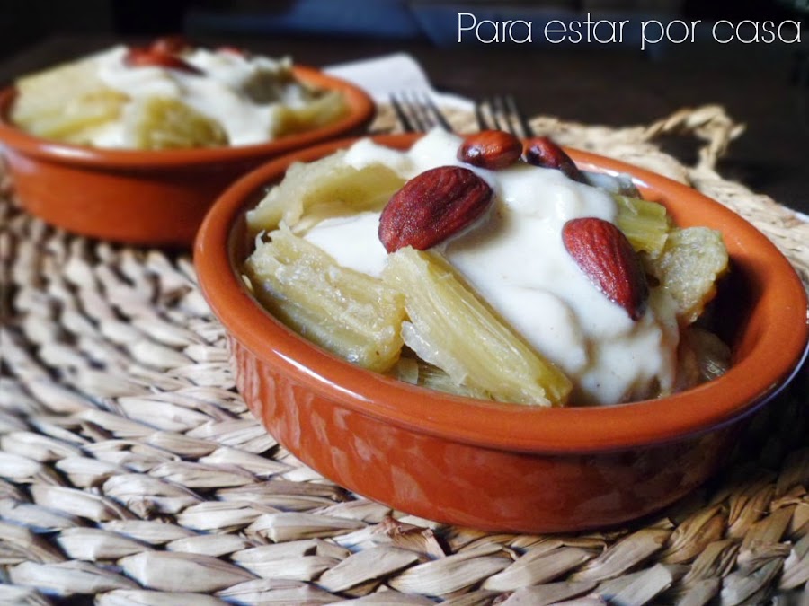 Los cardos en conserva nos ahorran todo el proceso de limpiarlos y de hervirlos después, por eso Chus, de Para estar por casa, ha aprovechado un frasco que tenía en la despensa para preparar Cardos "a la riojana" con almendras.
