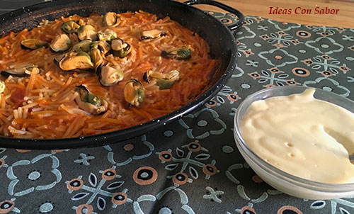 Nathalie, del blog Ideas con sabor, nos presenta una Fideuá con mejillones. "La fideuá es un plato marinero originario de la Comunidad Valencia, concretamente de Gandía. Se elabora de forma parecida a la paella pero el ingrediente principal, en vez del arroz, es el fideo. Al ser una receta para aprovechar lo que tenemos en nuestros armarios de la cocina, pues no le he puesto ningún otro ingrediente como pescado o marisco, sólo los mejillones".
