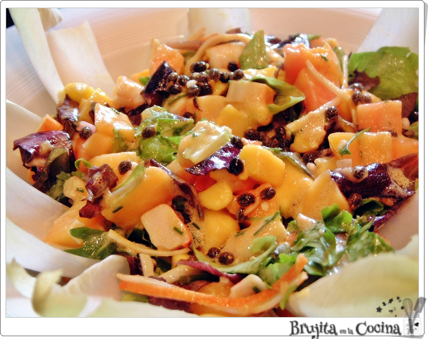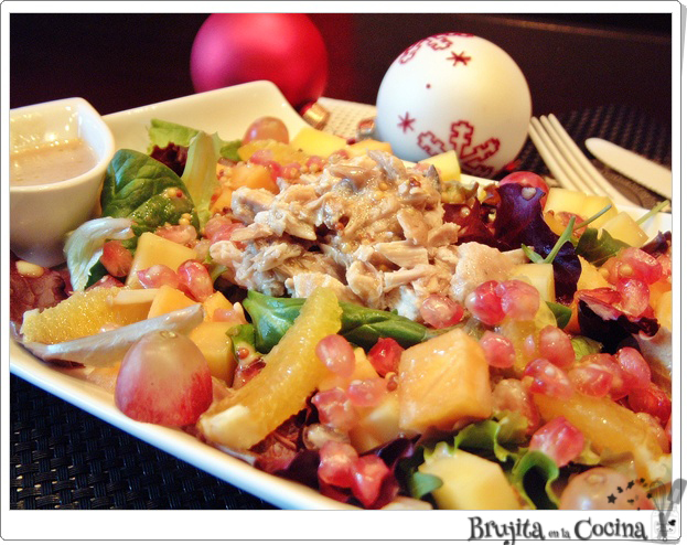 2. La segunda propuesta es la primera ensalada navideña que preparé de éxito asegurado, es la favorita de mi hermana aunque a ella le sustituyo los langostinos y el cangrejo por queso feta. El aliño y la combinación de frutas es lo que le da un toque con el que triunfarás seguro. Animate a la Ensalada Navideña