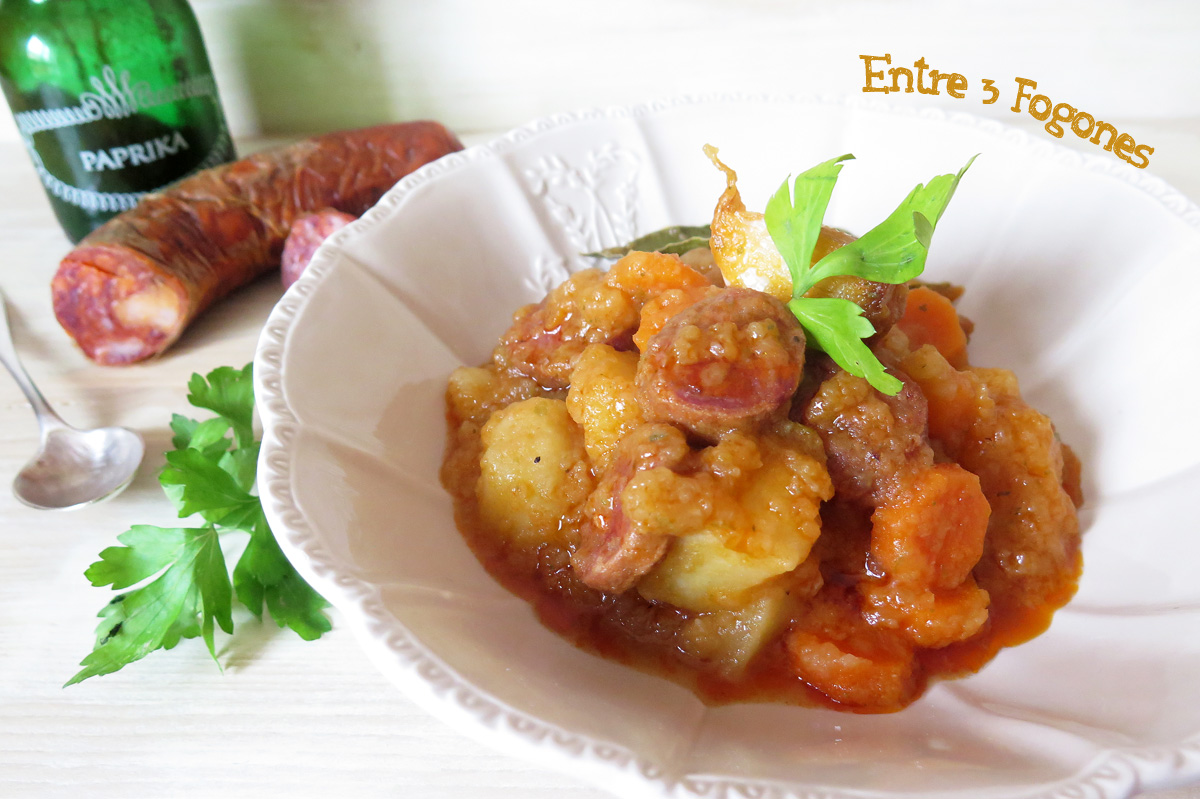 En el blog Entre fogones tenemos un plato de cuchara patatas a la riojana Inma nos cuenta que ha cambiado un ingrediente de la receta para aportar verduras.