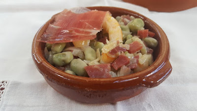 Eva del blog La cocina de las Molina, no quiere olvidar las verduras en épocas festivas, y nos propone unas habitas con jamón ibérico y langostinos.