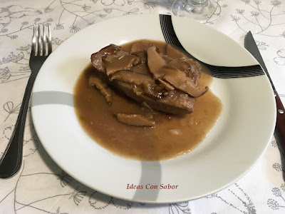 Otro plato que nos gusta mucho y que viene de manos de Isabel, lomo a la sidra, podemos ver la receta completa en el blog Las Delicias de Isabel.