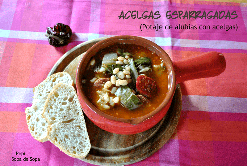 Desde el blog Sopa de sopa, Pepi nos envía acelgas esparragás, un plato almeriense que se puede preparar con garbanzos o, en este caso, también con alubias.