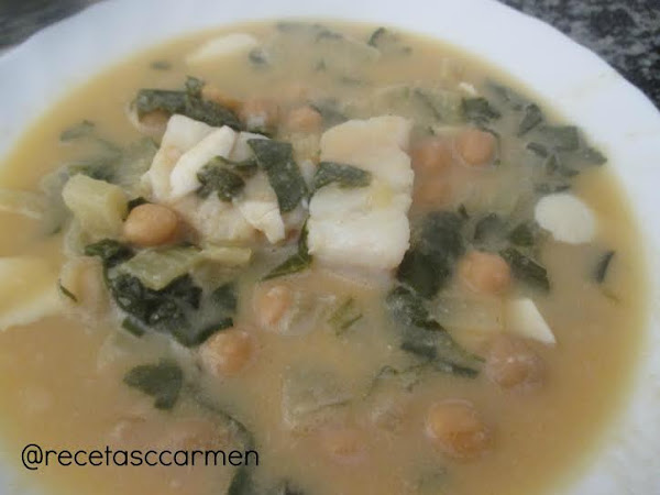 Mª José, una participante sin blog, no ha querido dejar pasar la oportunidad de estar en este recopilatorio y ha preparado garbanzos con bacalao, un plato bien rico y nutritivo.