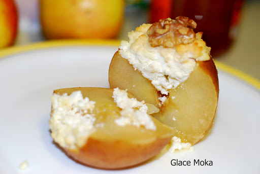 Lidia del blog Glace Moka vuelve a la carga con estas espectaculares Manzanas rellenas de requesón y miel. Una receta completa para coronar una buena comida, ¿no creéis?