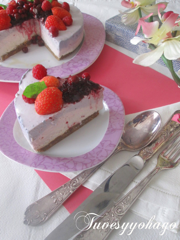 Por último yo he optado por utilizar la mitad de los ingredientes que vienen en el libro y preparar una sola tarta en un molde de 20 cm. Y como no encontré arándanos frescos utilice frutos rojos en conserva (grosellas, arándanos y moras). El resultado es espectacular, la textura muy delicada y el sabor gratamente sorprendente. Para mi gusto lo mejor, la base de galletas. La miel y la canela le dan un sabor increíble y al endurecerse queda supercrujiente: una delicia.