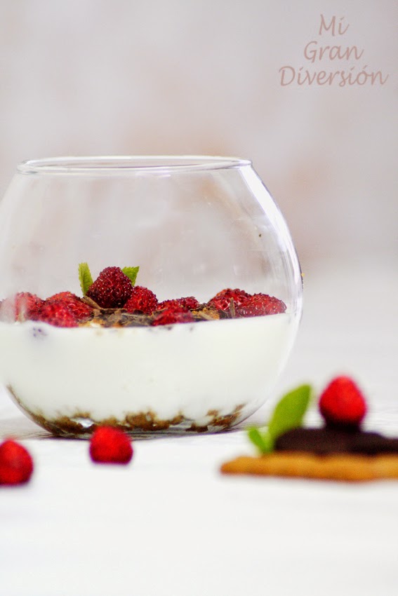 Copa de yogur con fresas silvestres, galletas y virutas de chocolate
