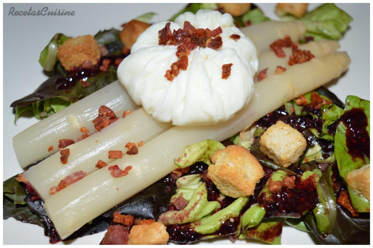 Espárragos Blancos con Huevo Poché, Sal de Jamón y Vinagreta de Moras