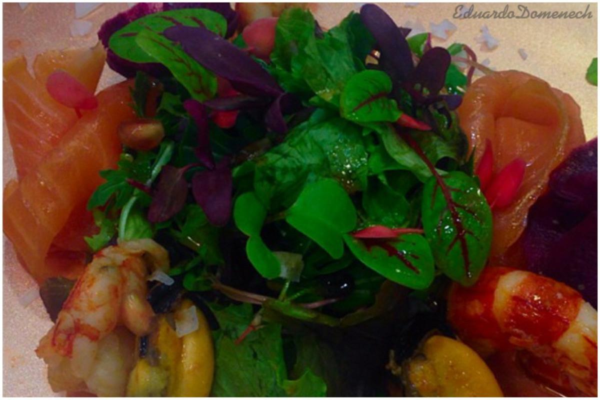 Ensalada de Brotes Tiernos con Gambas, Mejillones, Salmón Ahumado y Vinagreta de Granada
