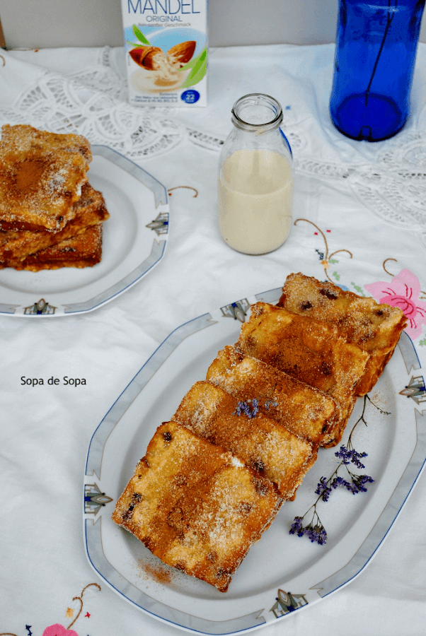 Pepi, del blog Sopa de sopa, se quedó antojada de unas torrijas y las ha adaptado a nuestro reto este mes, haciendo unas torrijas con leche de almendra, que ha comido hasta su marido que no es de torrijas.