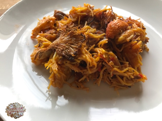 Directo de La cocina de Estela tenemos una fideuá de setas gambas y peregrinas, como nos cuenta Estela, la ha hecho con fideos finos que previamente ha tostado.