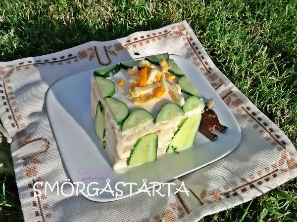 Verónica, del blog Cocinando para mis cachorritos, ha preparado Smörgåstårta, un pastel salado sueco que intercala capas de pan de molde y el relleno que se elija: tradicionalmente huevo cocido y salmón. Se decora de forma artística con vegetales, especialmente con pepino.