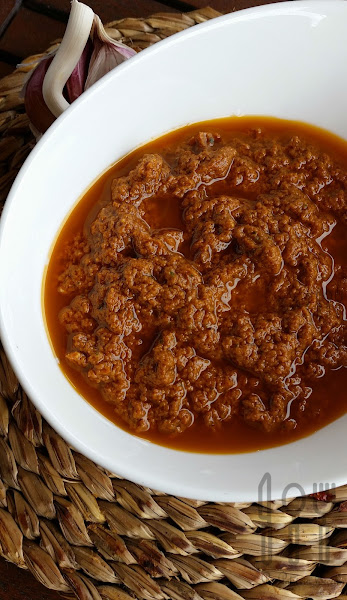 Patricia, del blog Las cosas de mi cocina, ha preparado un suculento pesto rosso o pesto siciliano, cuyo aspecto recuerda a algunas salsas catalanas como la romesco o la salvitxada con la diferencia de que éstas no llevan albahaca.