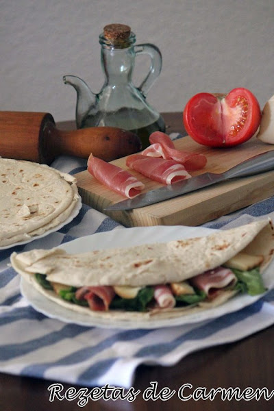 Carmen, del blog Rezetas de Carmen se ha decantado por una piadina. Se trata de un plato típico de las provincias de la Romagna en la Región Emilia-Romagna que consiste en un pan plano que se utiliza para bocadillos con productos típicos de la zona como el queso scamorza o el jamón specke y rucula. Ella nos trae una piadina romagnola