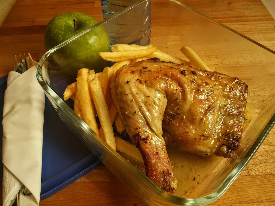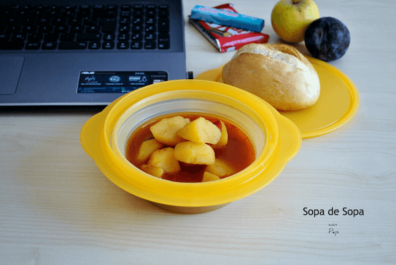 Lourdes de Pikeritas Way nos comenta que las personas celíacas necesitan en muchas ocasiones comer de táper; así que ella ha preparado un menú completo apto para celíacos: una sopita de fideos de primero, y un pollo con tomate y patatas panaderas de segundo.