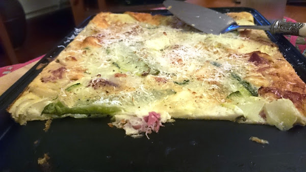Colocamos en un recipiente la mezcla conseguida de batir los huevos, harina y leche junto con los calabacines, ajos tiernos, ajo, jamón y queso. Guardando un poco de queso para espolvorear más tarde. Añadimos sal y pimienta. Lo colocamos todo en la bandeja preparada para ir al horno. La mezcla no debe ser más alta de 1 cm. Añadimos el aceite de oliva por encima y un poquito más de sal y pimienta y horneamos por espacio de 25 minutos o hasta que esté dorado y crujiente.