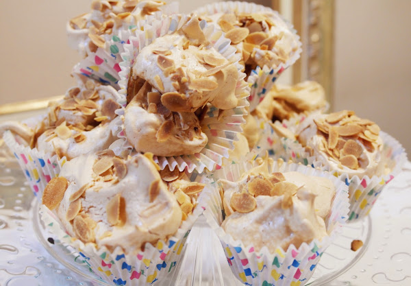 Tostar la almendra fileteada al horno a unos 250º (así aprovechamos para precalentar el horno) Sacar cuando este dorada pero dejamos el horno encendido). Montar las 6 claras de huevo a punto de nieve (es importante que cuando separemos la yema de la clara no se nos queden ningún resto de yema) Sin dejar de batir añadimos el azúcar poco a poco. Rellenar las paperinas de magdalenas hasta mitad, echar un pellizco de almendra y acabar de rellenar con el merengue y volvemos a echar un poco de almendras (al final no utilicé todo el paquete de almendras así que podéis guardarlo en un bote para utilizarlo en otras recetas y ya lo tenemos horneado). Meterlas en el horno a 100º solo con ventilador ya que deberán estar de 2 a 3 hrs (yo las tuve 2 hora y media) e ir comprobando pinchando con un palillo hasta que éste salga limpio.