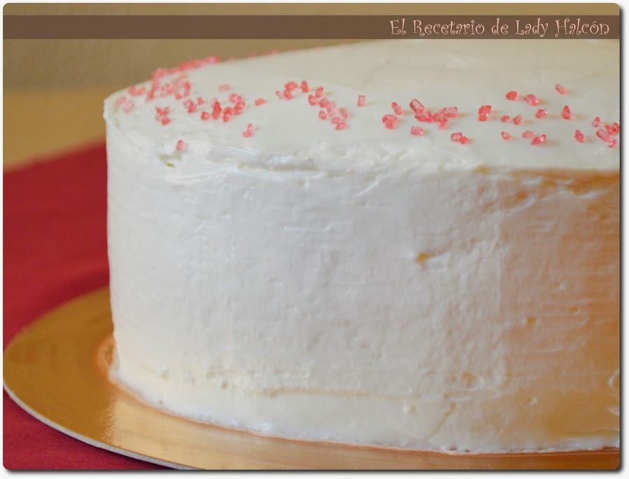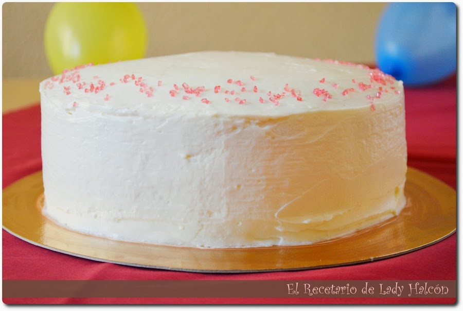 Para cubrir la tarta le di dos capas, dejando un tiempo de reposo entre cada una de ellas. Más o menos seguí las instrucciones de Bea, así que os dejo el enlace a la entrada en la que explicó divinamente cómo rellenar y cubrir un layer cake, que a mi todavía me queda bastante práctica jeje.
