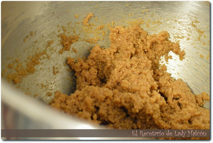Con la ayuda de una batidora mezcla la mantequilla cortada a dados con el azúcar moreno hasta que obtengas una crema suave y homogénea. También lo puedes preparar a mano con la ayuda de una cuchara de madera :).
