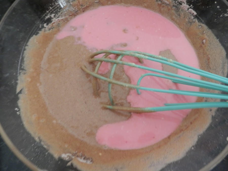 En otro bol, mezclaremos la buttermilk, el vinagre, el colorante y la esencia de vainilla. Os recomiendo usar el colorante en pasta, porque el color es más intenso y más cubriente, yo lo utilicé en líquido y no cogió casi color.