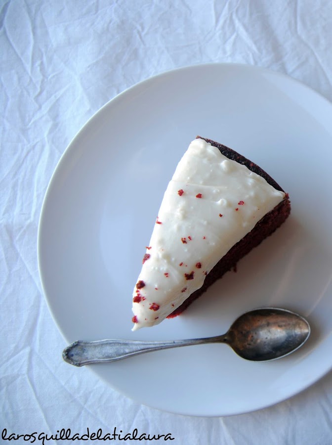 Tenéis que tener en cuenta que esta tarta lleva cacao en polvo, que junto con el colorante es lo que hace que tenga ese rojo oscuro. Veréis por internet fotografías de bizcochos con un rojo muy intenso, cuanto menos cacao le pongáis más subido de tono os quedará.