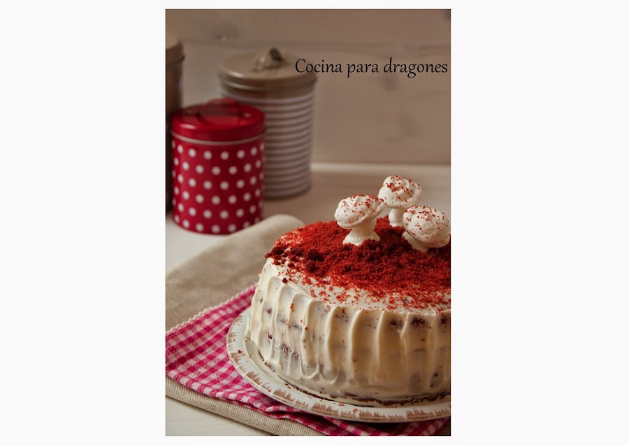 Unos amigos nos invitaron a cenar a su casa el otro día y, lo primero que me vino a la cabeza fue:"Red velvet", así que me puse a investigar. El red velvet cake es bizcocho de cacao, pero despista un poco ya que se tiñe de color rojo, de ahí su nombre. Normalmente se utiliza colorante alimentario para hacerlo, aunque he encontrado versiones más naturales hechas con remolacha, por ejemplo. Se suele acompañar de una crema blanca con sabor a vainilla. La presentación puede variar bastante, podemos hacer desde un nude cake o "Pastel desnudo", es decir, sin cubrir, simplemente relleno hasta una tarta cubierta de crema decorada con boquilla y manga pastelera. En esta ocasión, he optado por una decoración sencilla: una cobertura finita de crema, unas migas del mismo bizcocho por encima y unas setas de merengue que vi en el blog La Receta de la Felicidad. El resultado fue un bizcocho diferente que sorprendió por su textura y sabor. Os dejo con la receta...