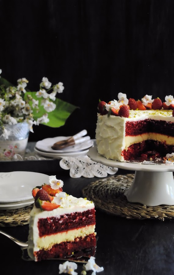 Hola cielit@s, ya amenacé con volver a la carga con los cheesecake, pero si el Dulce de Leche os gustó a vosotr@s y a mí, no os quiero ni contar lo que os va a gustar este Red Velvet Cheesecake, es más completo que un cheesecake normal, pero menos pesado que un layer, ya que no lleva crema entre las capas.