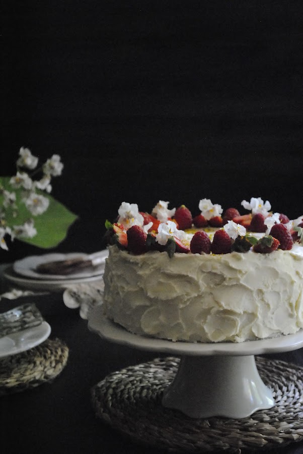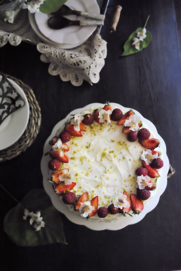 He decorado con unas fresitas, frambuesas y pistachos picaditos, las flores son de mi jardín sin tratamiento ninguno, de todas formas era para la familia y amigos y nadie se me ha muerto, tuve la precaución de enseñarla así de mona, y luego quitarle las flores, no fuera ser que alguno se las comiera?.