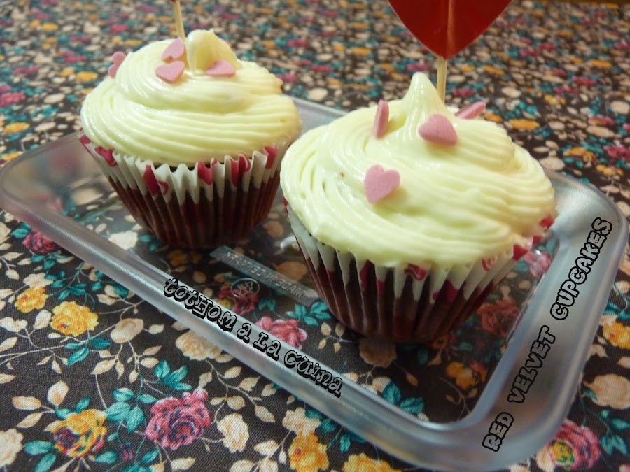 Es la primera vez que hago cupcakes. Me pilló en "pana" como se suele decir. No tenía red velvet, ainsssss menos mal que pude conseguirlo sin problemas, contando que donde vivo en la única tienda que hay de repostería no tenía. No tengo robot de esos tan "bonitos" para hacer la buttercream, lo hice con una batidora de varillas normales y tercer problema, la manga pastelera y la boquilla, quizás no es la más apropiada.