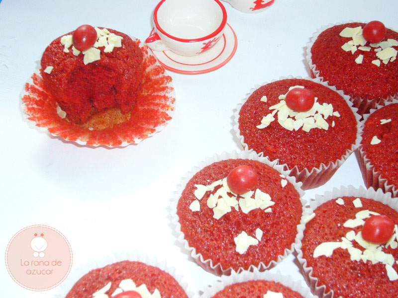 No puse frosting porque aunque no os lo creáis no he encontrado chocolate blanco en ningún super, quería hacer una ganache porque los frostings de mantequilla soy incapaz de comerlos, tanta mantequilla me supera, así que al final se quedaron así, los decoré con virutas de chocolate y con caramelitos de red velvet comprados en American food house que podéis ver en la foto.