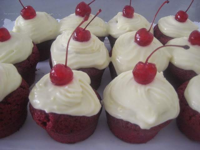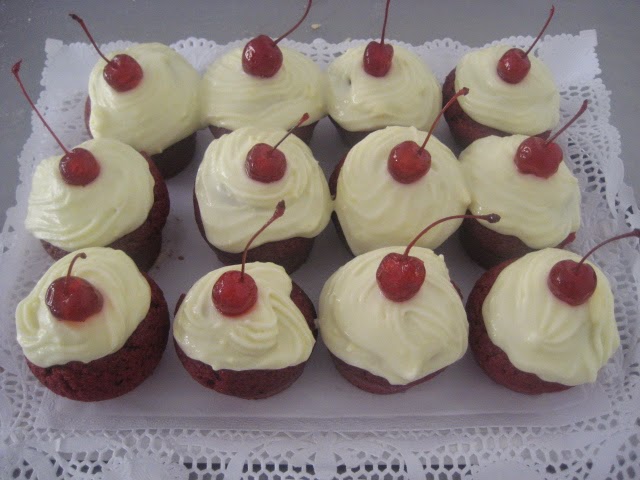 Preparación: En un bol mezclar bien los ingredientes secos, tamizarlos y reservar En otro bol mezclar bien los ingredientes húmedos. Incorporar 1/3 de los ingredientes secos sobre los húmedos, e integrar. Ir echando el resto de los ingredientes secos, con movimientos envolventes, hasta que estén justo incorporados, pero bien integrados. Poner cucharadas de esta mezcla en una bandeja para muffins, y llenar las ¾ partes . Introducir en el horno precalentado durante 15 minutos, o hasta que al pinchar con un palillo este salga limpio. Mientras se enfrían hacer la crema de queso. Para ello: Batir durante 1 minuto todos los ingredientes excepto el azúcar glas. Ir añadiendo el azúcar poco a poco hasta que esté bien incorporado. Una vez hechos los cupcakes y la crema de queso decorar éstos con la crema de queso puesta en manga pastelera con boquilla rizada gruesa