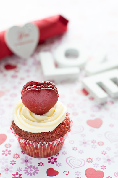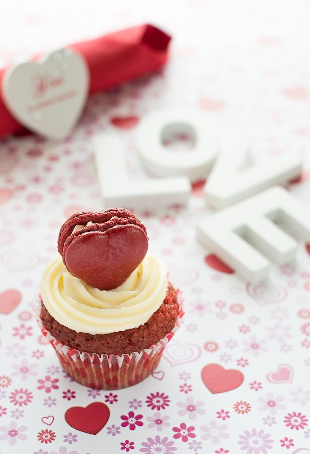 Para los macarons podéis seguir esta receta (hice la mitad de las cantidades), pero en el momento de formar las conchas tener preparada una plantilla de corazones, o si sois valientes como yo hacerlo a pulso. Rellenar con la misma crema de los cupcakes.