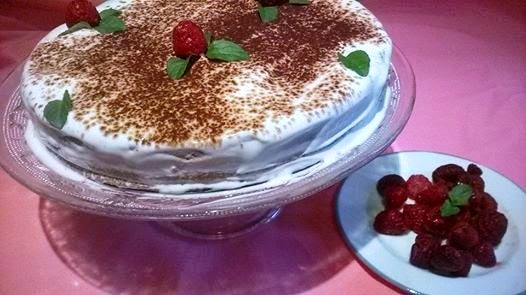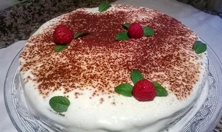 Rellenar y cubrir. Yo lo decoré con chocolate en polvo y algunas frambuesas congeladas que tengo en la nevera.