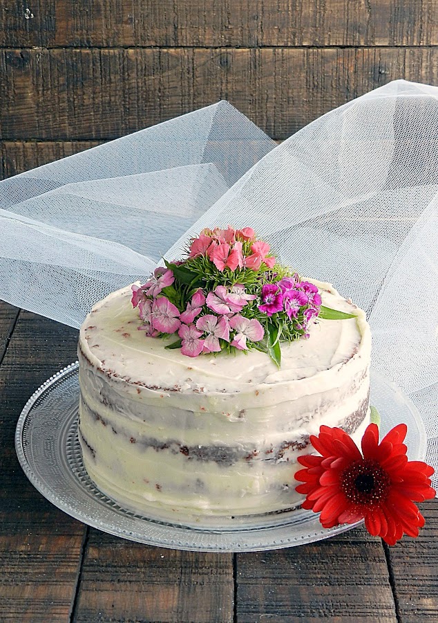 Con ayuda de una espátula forramos toda la tarta con una capa ligera de frosting de queso. En este caso podríamos si queréis darle otra capa para que quede más lisito pero yo sólo le di una porque quería darle un toque más rustico para decorarla con flores naturales.