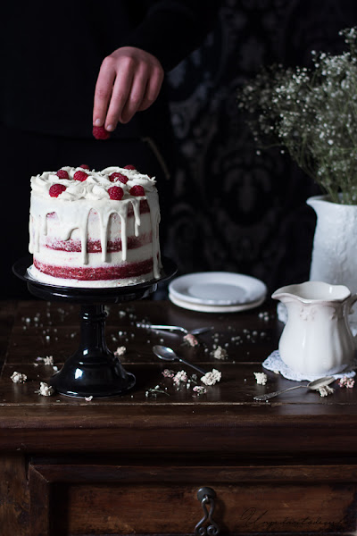Yo he optado por una decoración semi nude, para ello basta con dar una sola capa de crema de queso y alisar con espátula, aparecerá el bizcocho por algunos lados y por otros no.