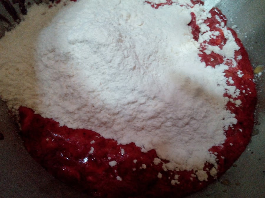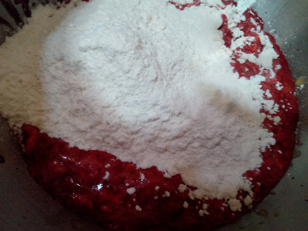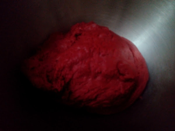En el tazón de la batidora colocamos el agua tibia junto con el azúcar, levadura y colorante rojo. Esperamos 5 o 10 minutos hasta que esponje la levadura.