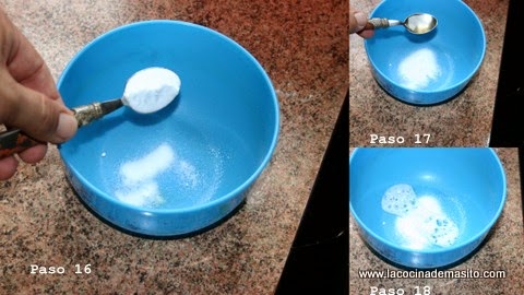 Paso 16, en un vaso echais la cucharadita de bicarbonato ( en la foto hay un cuanco, pero con un vaso pequeñito es mas que de sobra