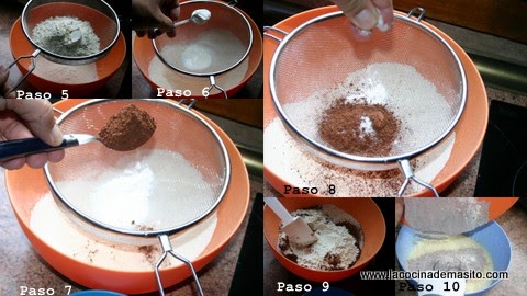 Paso 5, en otro bol aparte vamos a introducir los elementos secos, tamizamos la harina