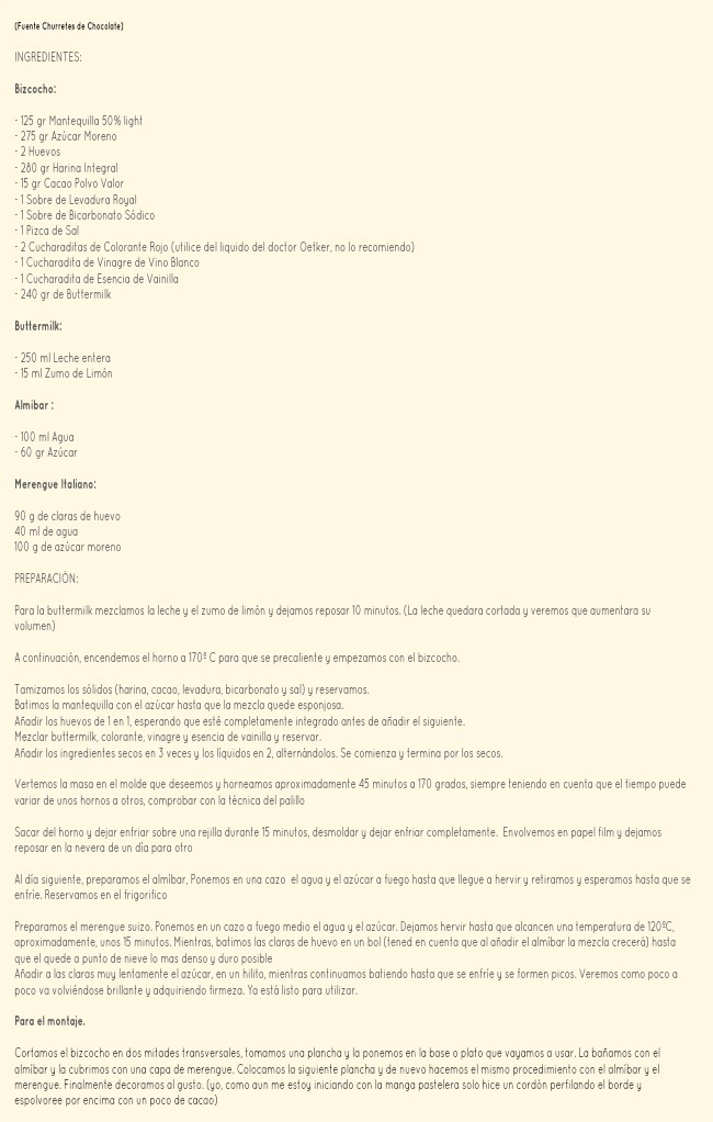La tarta elegida para hoy, ha sido la Red Velvet, ya sé que muy rojo no ha quedado el bizcocho y mira que al final acabe echándole el tubo entero de colorante, jejeje, Además, la muy puñetera se me ha resistido como nunca otra tarta lo ha hecho hasta ahora. He tenido que prepararla dos veces, para colmo el merengue no acababa de cuajar, y cuando le echaba el azúcar caliente se volvía mas líquido, a pesar de que le diera a máxima potencia con la batidora, al final éste, también al segundo intento, he conseguido que quedase bien duro, pero mi poco arte con la manga pues tampoco ayudado mucho. A pesar de todo, la tarta estaba de muerte y tan mal no ha quedado, digamos para el próximo año he de mejorar en materia de color, preparación del merengue y manejo de la manga... y sé que lo conseguiré en lo cabezota que soy, jejeje.