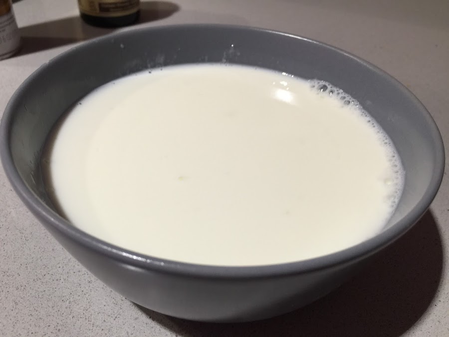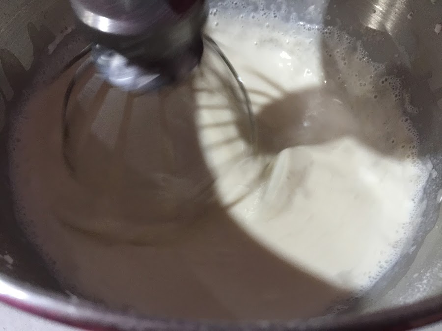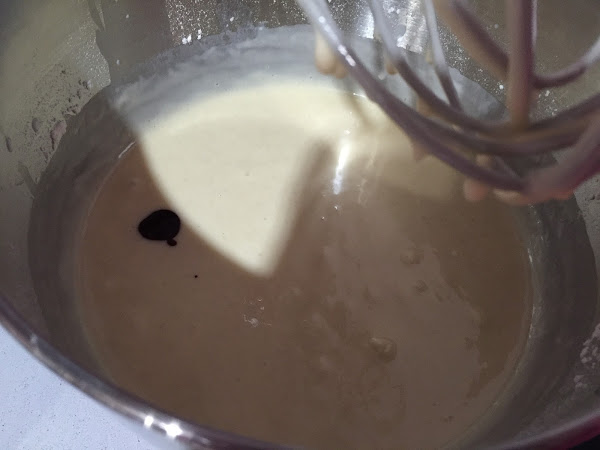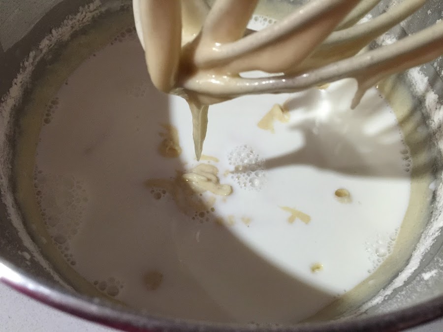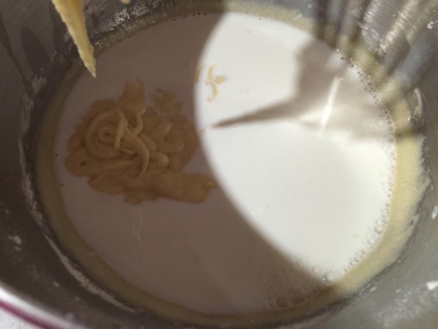 5. Añadimos la mitad de la leche. No os preocupéis si veis que tiene grumos, es normal, lo hemos conseguido añadiendo el zumo de limón para que se cortara, se llama buttermilk.