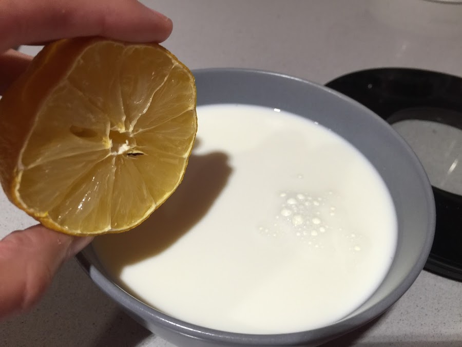 1. Precalentamos el horno a 180ºC. Ponemos los 350ml de leche en un bol junto con las dos cucharitas de zumo de limón. Dejamos reposar.