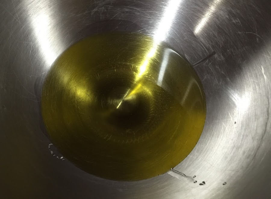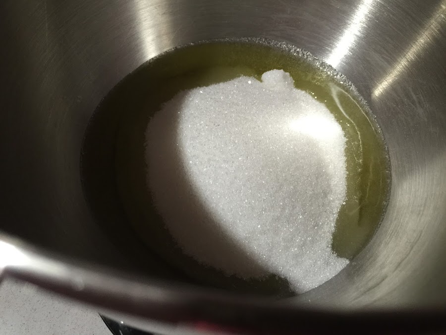 2. Ponemos en el bol de la KA el aceite junto con los tres huevos y el azúcar. Batimos bien hasta que sea una mezcla homogénea.