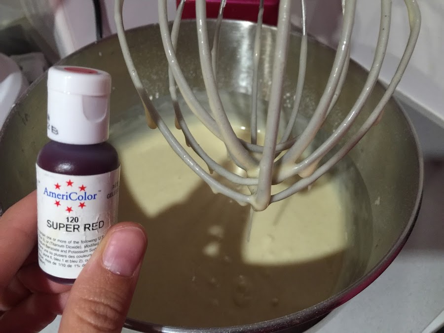 8. Añadimos la cucharadita de vainilla en pasta y el colorante rojo a la mezcla. Yo me quede un poco corta de colorante, ser generosos, dos cucharadas, para que el rojo nos quede muy muy intenso. Al hornear pierde color y interesa que la masa en crudo tenga un rojo bien vivo.