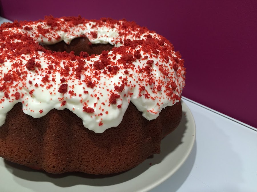 15. Cubrimos toda la superficie del bund cake con el frosting de queso. Ponemos unas migas por encima para decorar. A las migas les puse un pelin más de colorante para conseguir el rojo intenso. Ahora si que si, a comer. Si no lo vais a comer al momento recordar que hay que guardarlo en la nevera para que se conserve. En el caso que sobre, también guardarlo en la nevera.