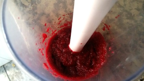 - Pelamos y cortamos la remolacha en dados pequeños y lo metemos en una trituradora. Incorporamos también el vinagre, el limón y el buttermilk. Trituramos hasta conseguir un puré fino, sin grumos. Reservamos.